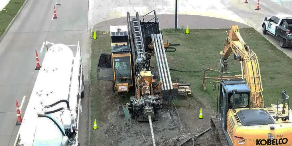 “We were crossing several intersections, so we couldn’t pump slurry back to the mud recycling system. It had to be hauled with vacuum excavators,” explained Aaron. “To delay flow to the exit side, we performed the pilot bore and the first couple of reamer passes without punching out, so the fluid only had one way to go. Our onsite mud engineer monitored our fluid returns to make sure we were getting the majority of it back and made adjustments to our drilling fluid mix when needed.”